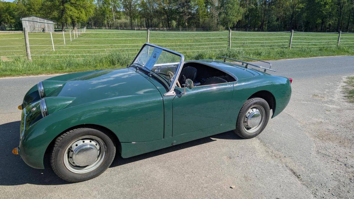 In klassischem British-Racing-Green mit einer schwarzen Innenausstattung zeigt sich der Sprite in einer der begehrtesten Farbkombinationen. Unter der Haube arbeitet ein 1275 cm³ Motor mit 67 PS, der dem leichten Roadster ein erstaunlich lebendiges Fahrgefühl verleiht – spritzig, puristisch und typisch britisch.