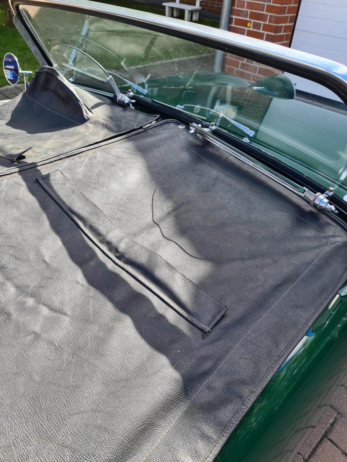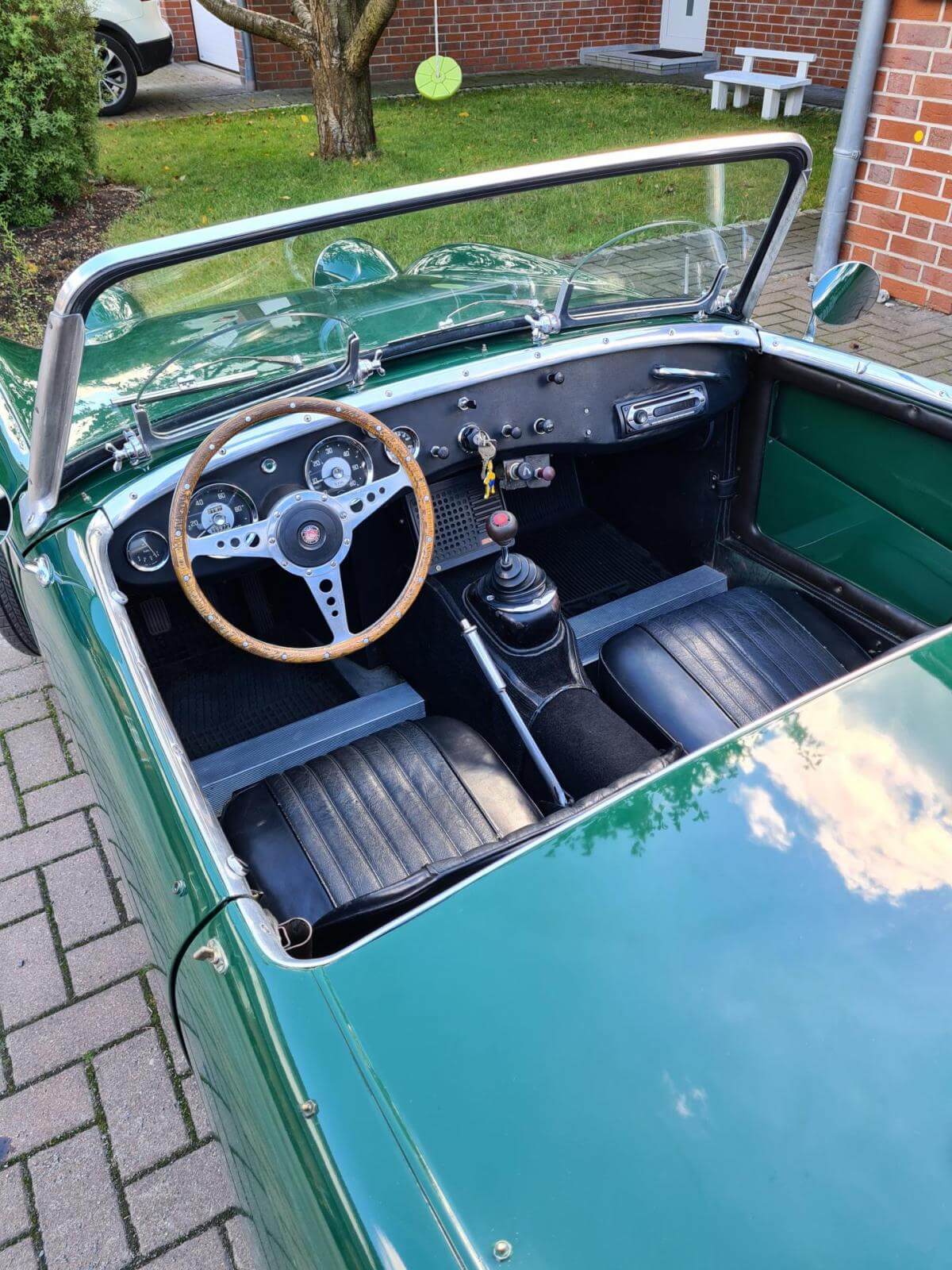Der Wagen kommt mit sehr viel Zubehör, wie z.B. ein Verdeck, die Cabrio-Abdeckung, Brooklands-Scheiben, Healey-Radkappen u.v.m.