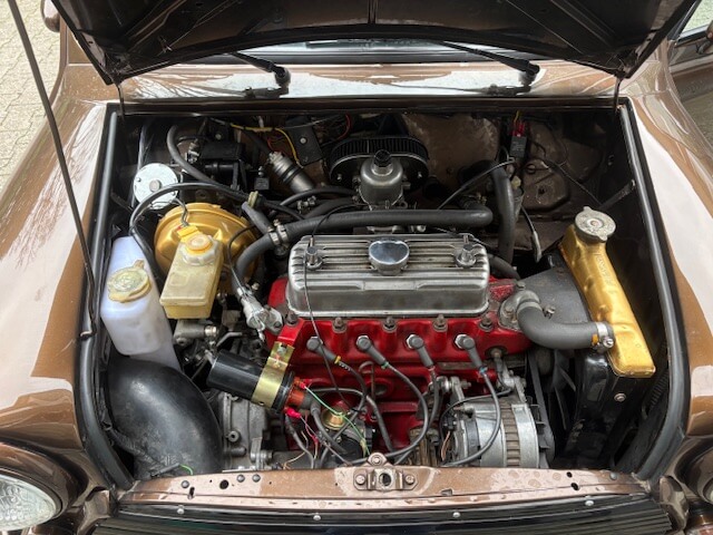 – Cooper-Vergasermotor 1275 cm³ (Umbau) mit Fächerkrümmer und Bastuck-Sportauspuff → realistisch ca. 65–70 PS (eingetragen 30 kW/41 PS)
