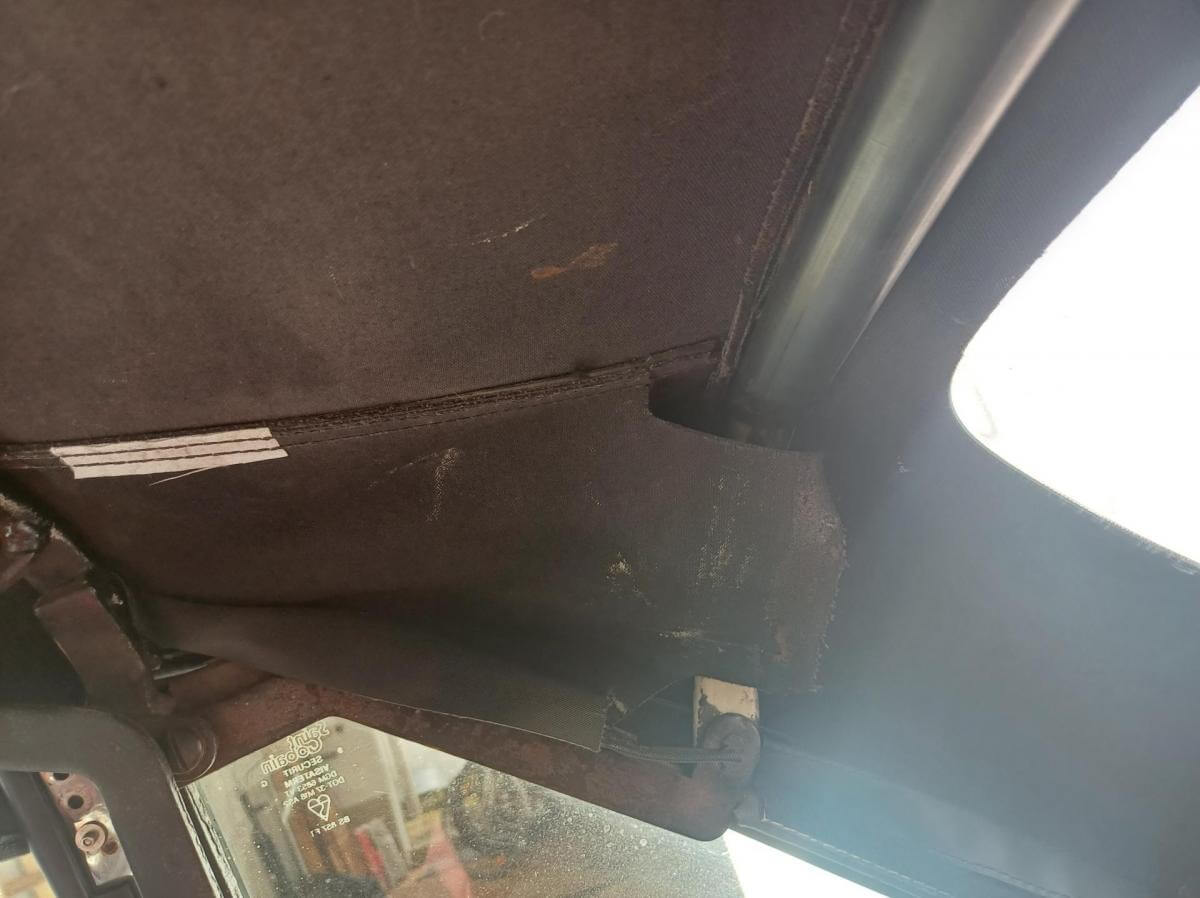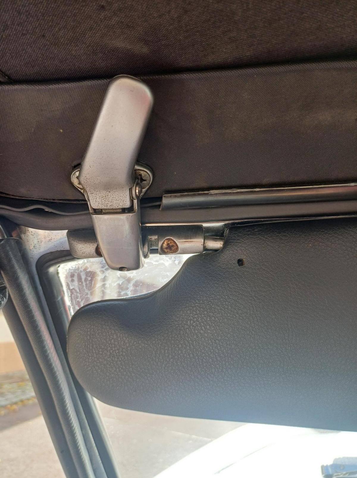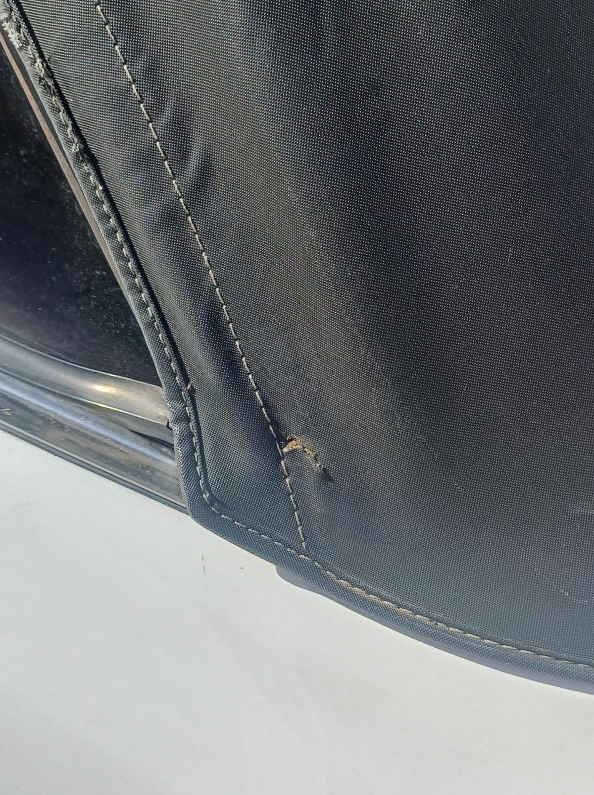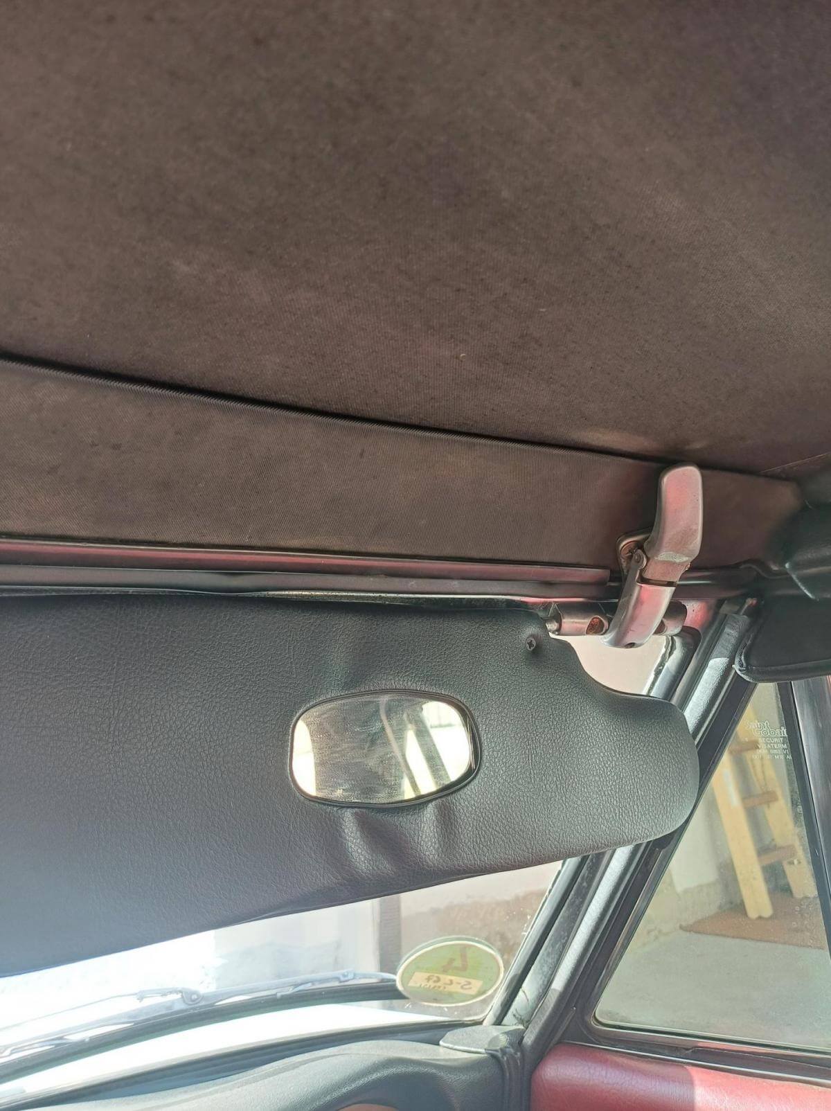 Weitere, uns bekannte Mängel sind auf den Bildern dokumentiert. Die Zierleiste der Fahrerseite schiebt sich beim Schließen des Daches nach vorne und die Abdeckung des Armaturenbrettes sitzt nicht mehr richtig in der Führung. Der Bezug des Fahrersitzes hat Risse und muss erneuert oder ausgebessert werden. Der Sitz des Fahrers neigt sich nach rechts. Vorgänger hat wahrscheinich stets aus dem Sitzen heraus das Dach geschlossen. Das Deck des Radios lässt sich abnehmen damit es bei geöffnetem Dach vor Diebstahl gesichert ist. Der Knopf zum Entnehmen fehlt. Es kann trotzdem entnommen werden. Ob es dafür noch ein Ersatzteil gibt ist fraglich. Bild vom Innenbereich zeigt Foto mit und ohne abnehmbares Radioteil. Zigarettenanzünder und Uhr funktionieren nicht. Stoffdach innen nicht ausreichend verklebt.