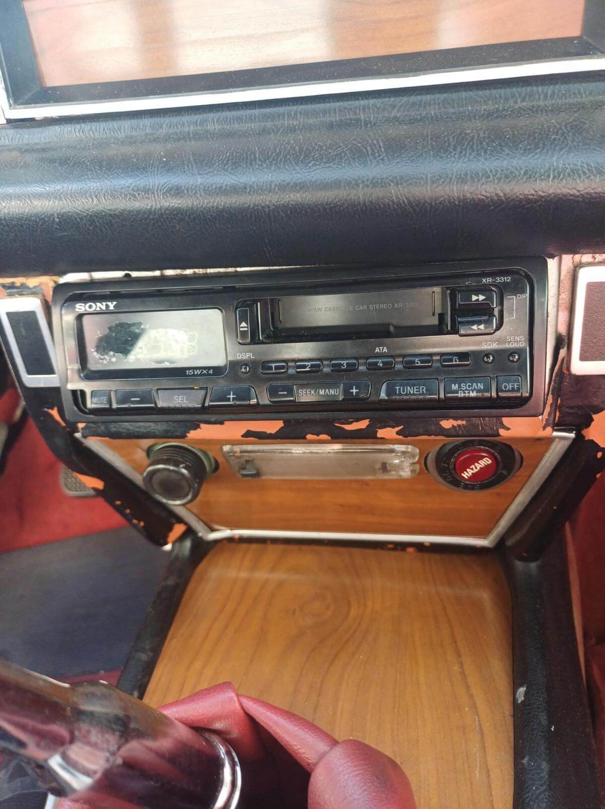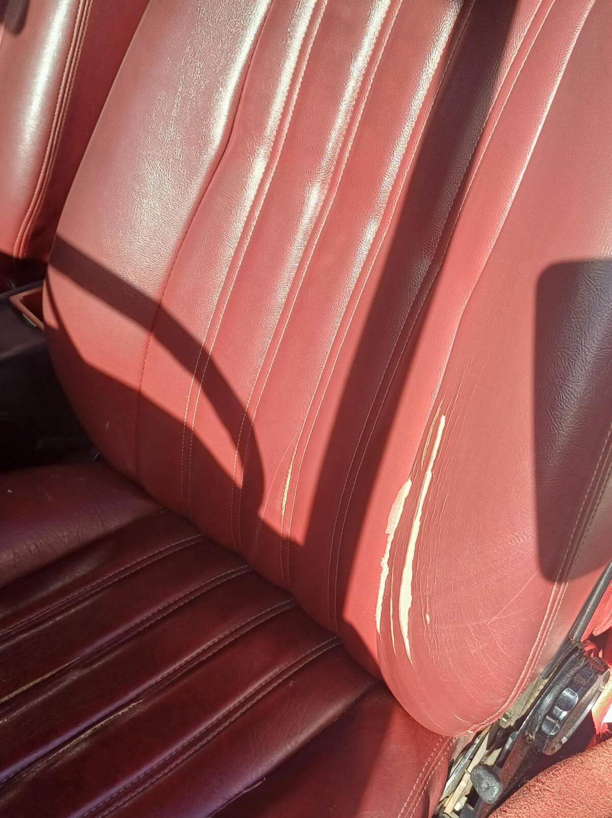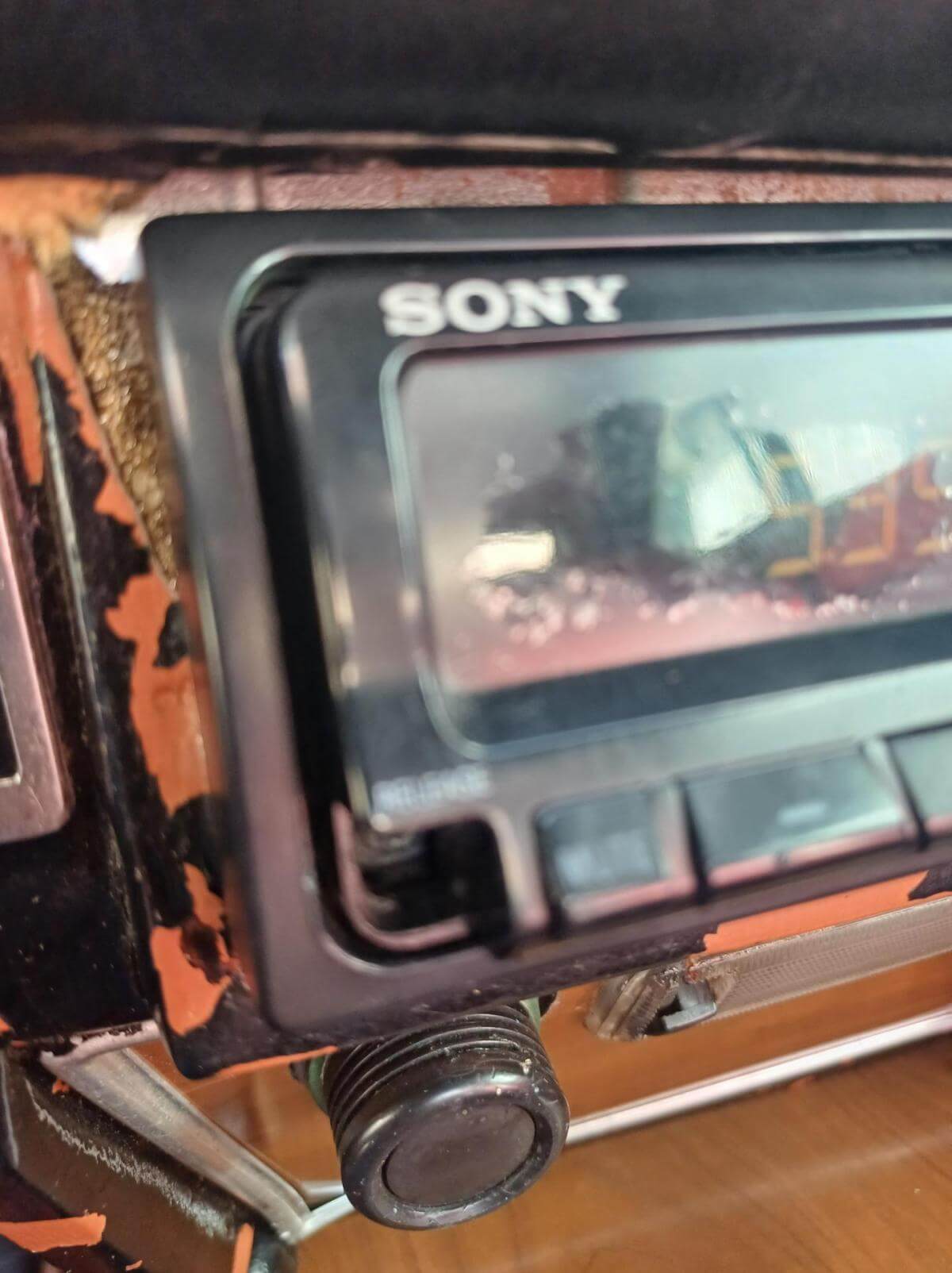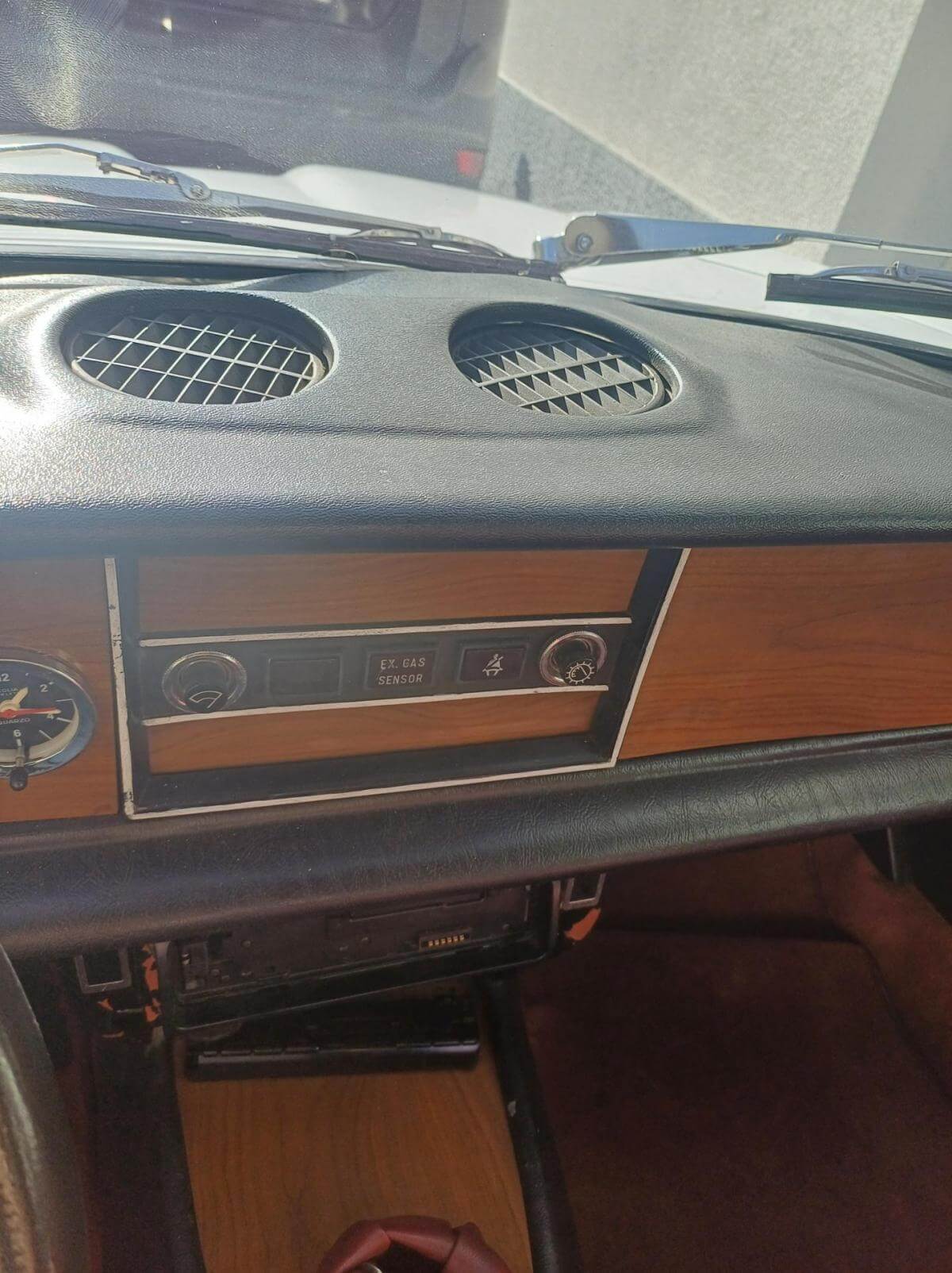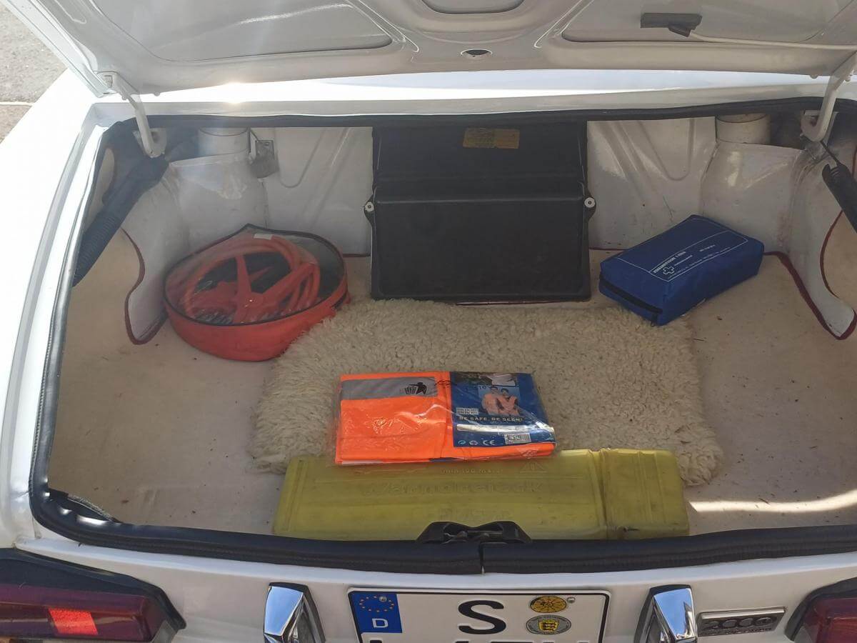 Weitere, uns bekannte Mängel sind auf den Bildern dokumentiert. Die Zierleiste der Fahrerseite schiebt sich beim Schließen des Daches nach vorne und die Abdeckung des Armaturenbrettes sitzt nicht mehr richtig in der Führung. Der Bezug des Fahrersitzes hat Risse und muss erneuert oder ausgebessert werden. Der Sitz des Fahrers neigt sich nach rechts. Vorgänger hat wahrscheinich stets aus dem Sitzen heraus das Dach geschlossen. Das Deck des Radios lässt sich abnehmen damit es bei geöffnetem Dach vor Diebstahl gesichert ist. Der Knopf zum Entnehmen fehlt. Es kann trotzdem entnommen werden. Ob es dafür noch ein Ersatzteil gibt ist fraglich. Bild vom Innenbereich zeigt Foto mit und ohne abnehmbares Radioteil. Zigarettenanzünder und Uhr funktionieren nicht. Stoffdach innen nicht ausreichend verklebt.