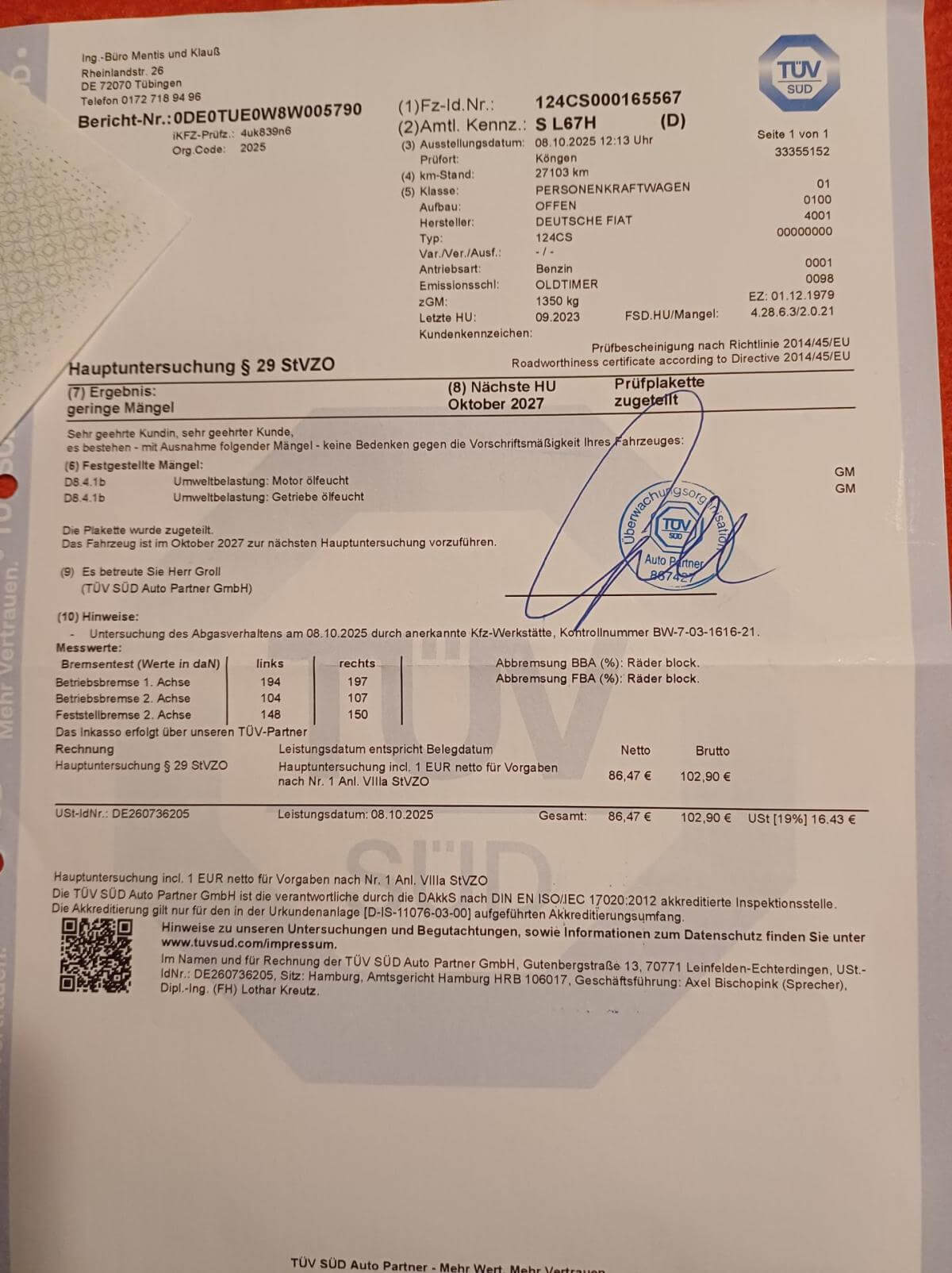 Tüv-Bericht vom Oktober 2025: Es bestehen mit Ausnahme folgender Mängel – keine Bedenken gegen die Vorschriftsmäßigkeit des Fahrzeuges: