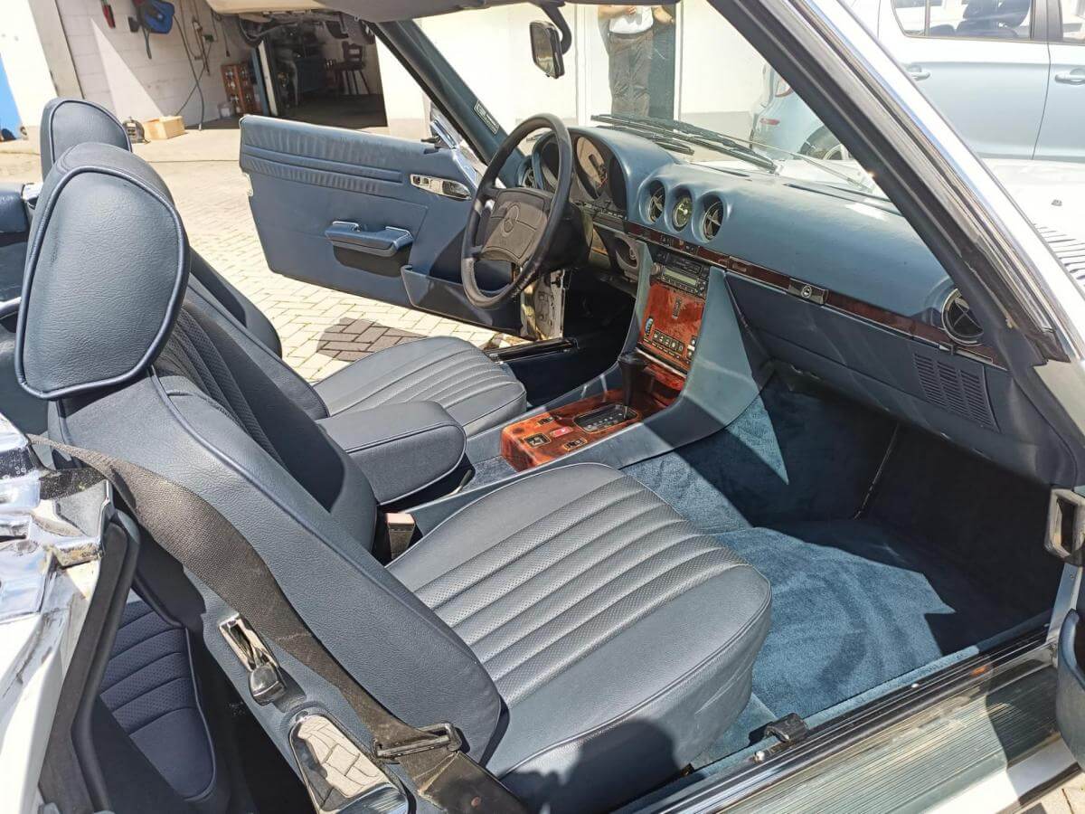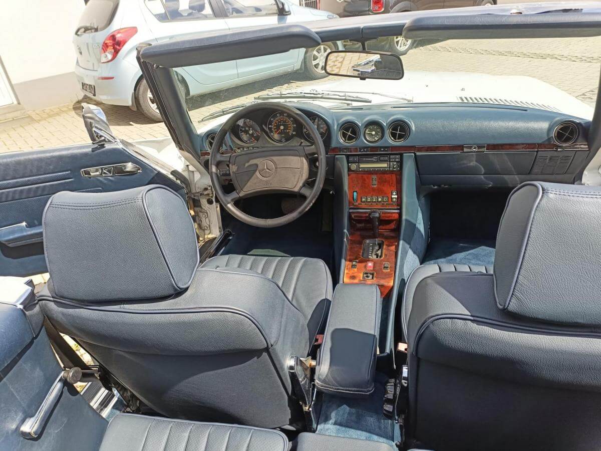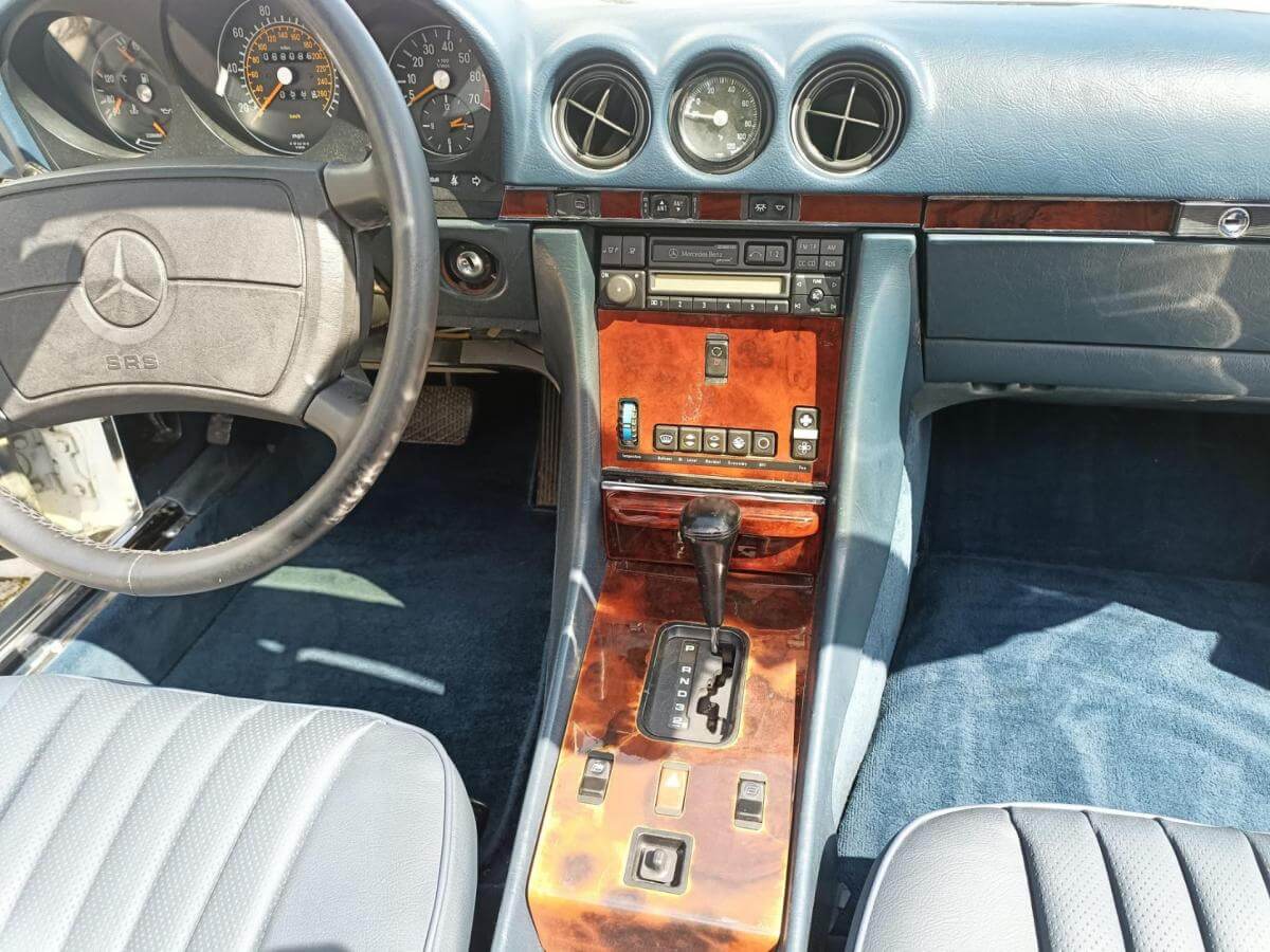 Dieser R107 wird angetrieben vom kraftvollen 5,6-Liter-V8-Motor mit 231 PS! Die Karosserie in Arktikweiß harmoniert perfekt mit der royalblauen Lederausstattung und dem dunkelblauen Verdeck.