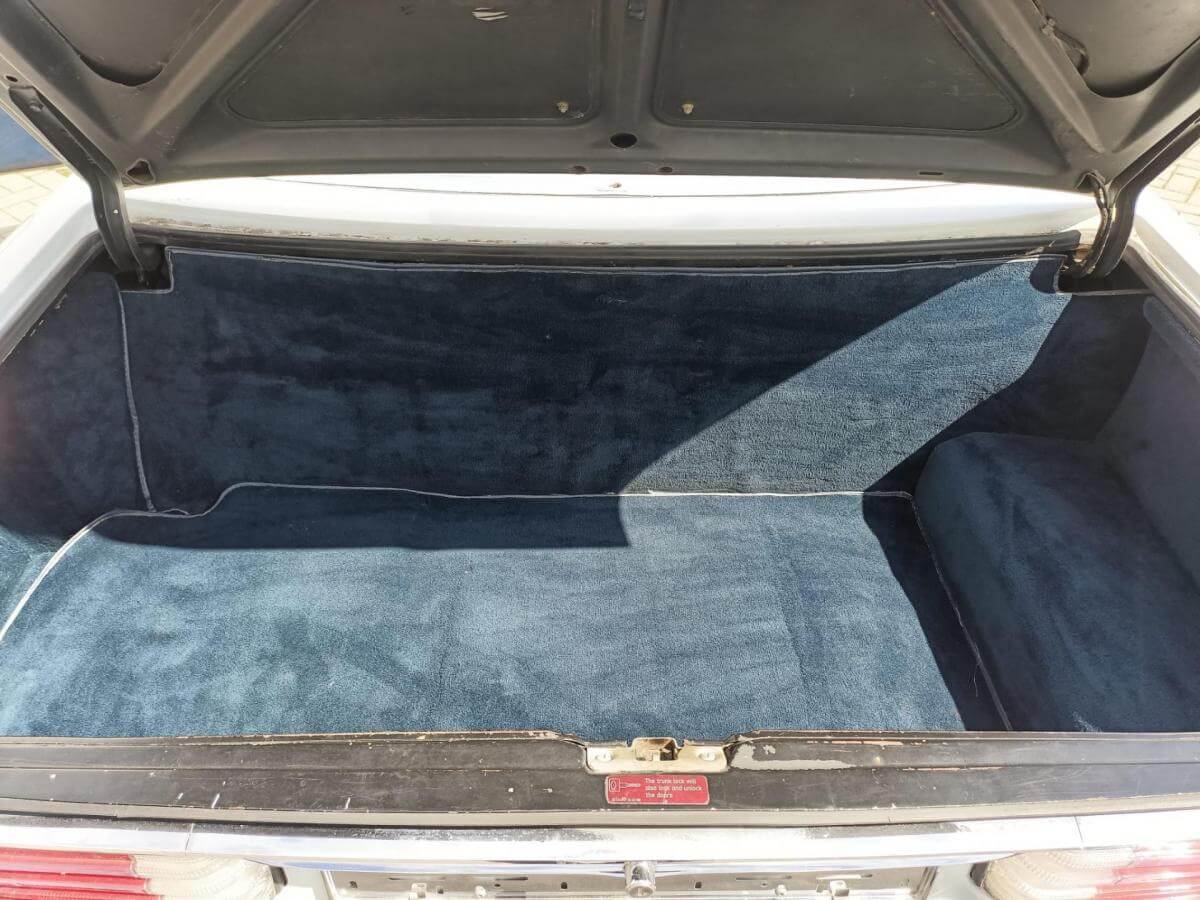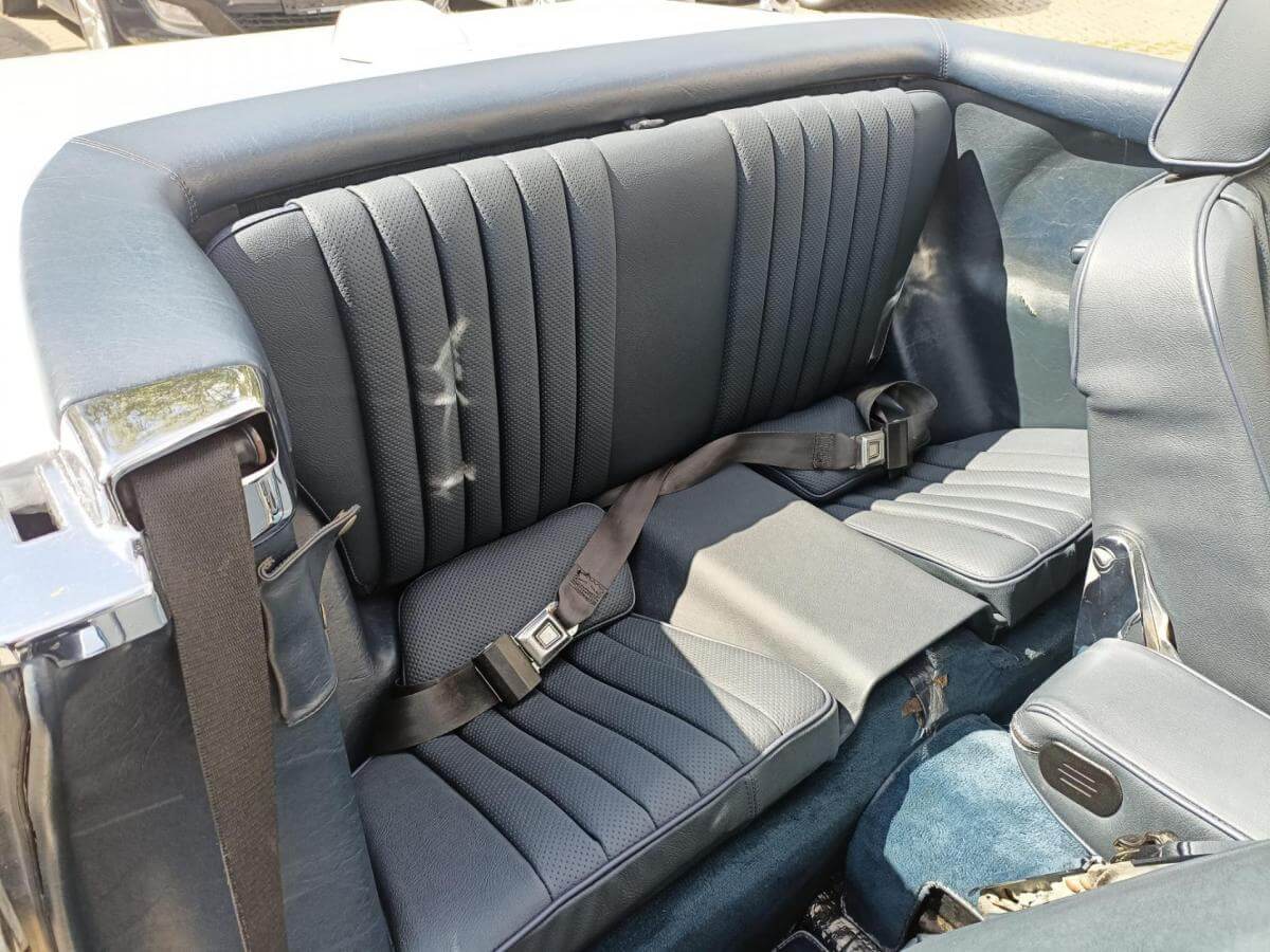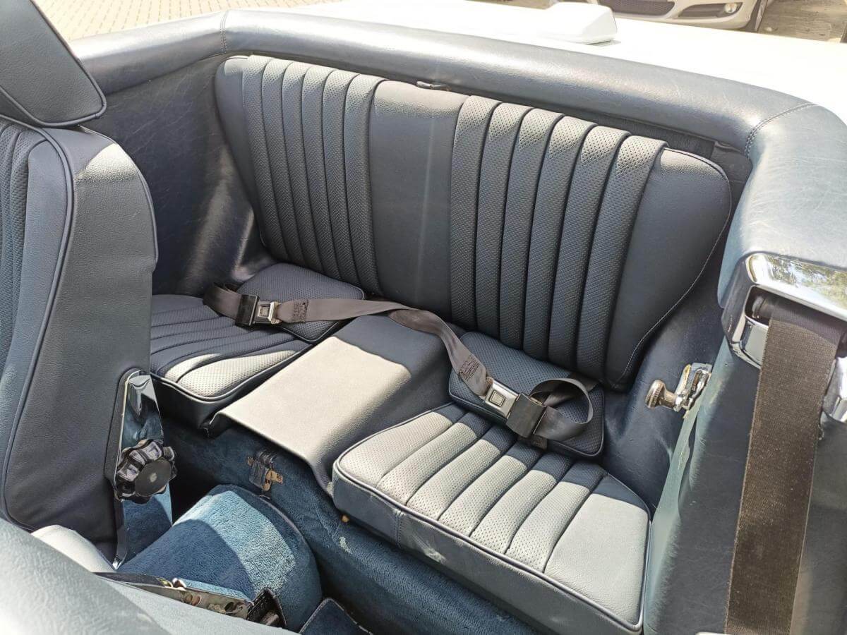 Dieser R107 wird angetrieben vom kraftvollen 5,6-Liter-V8-Motor mit 231 PS! Die Karosserie in Arktikweiß harmoniert perfekt mit der royalblauen Lederausstattung und dem dunkelblauen Verdeck.