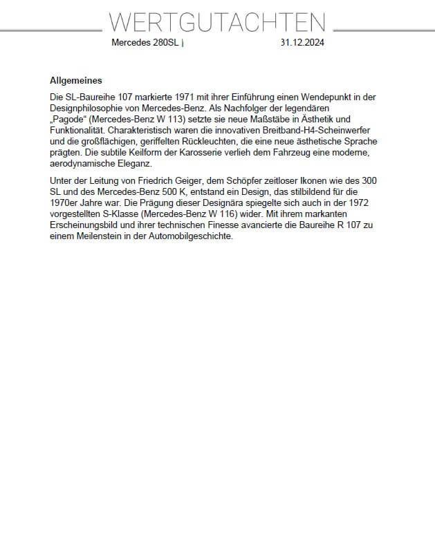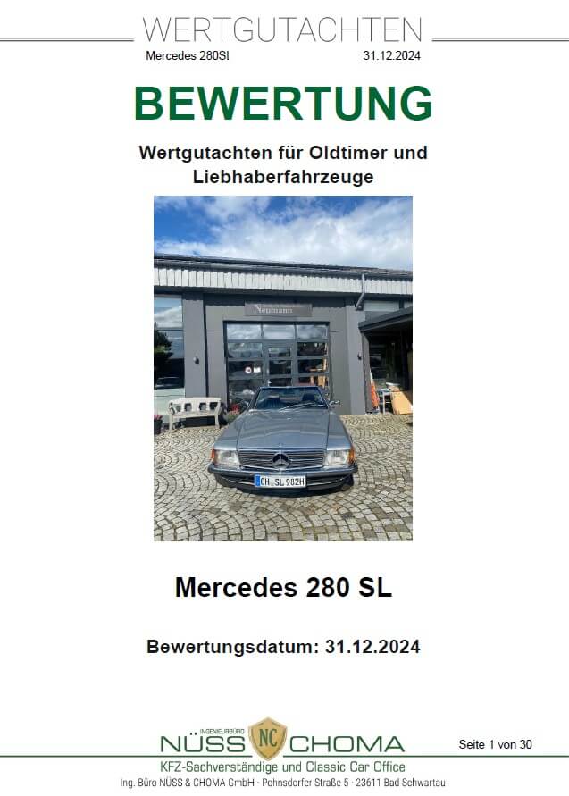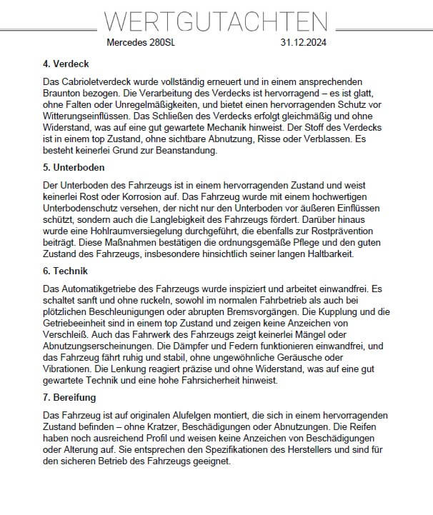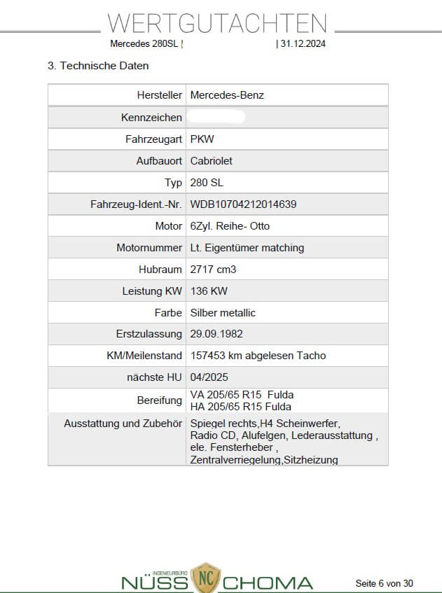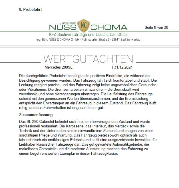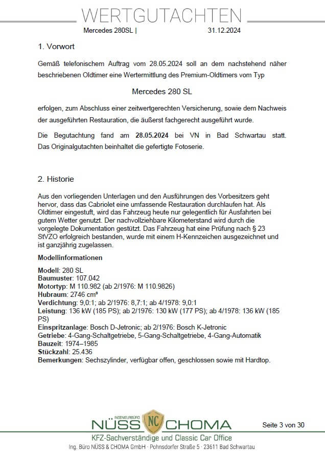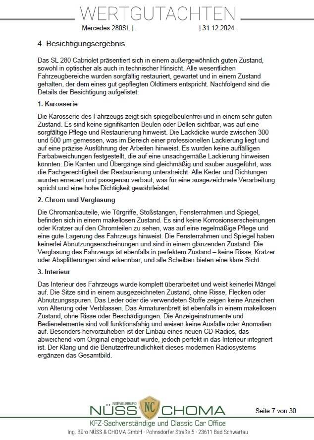 Das Fahrzeug ist in einem top gepflegten Zustand und ein Gutachten der Note 2 liegt vor. Es wurden schon einige Erneuerungen vorgenommen und es verfügt über frischen TÜV. Dieser 280 SL kommt außerdem mit einigen Extras wie z.B. einer Klimaanlage, einem Hardtop mit Lift und Ständer sowie einer Sitzheizung.