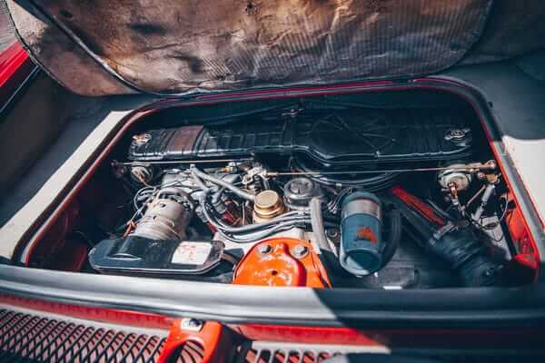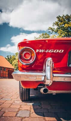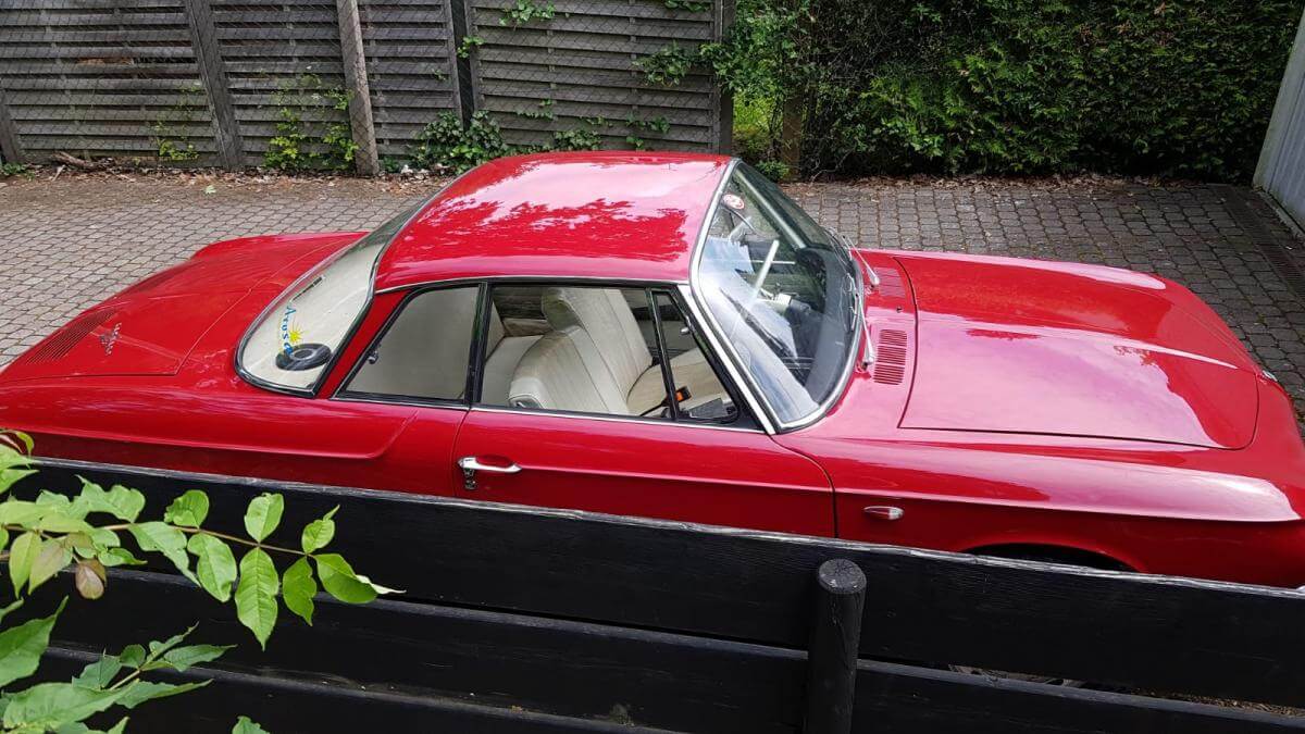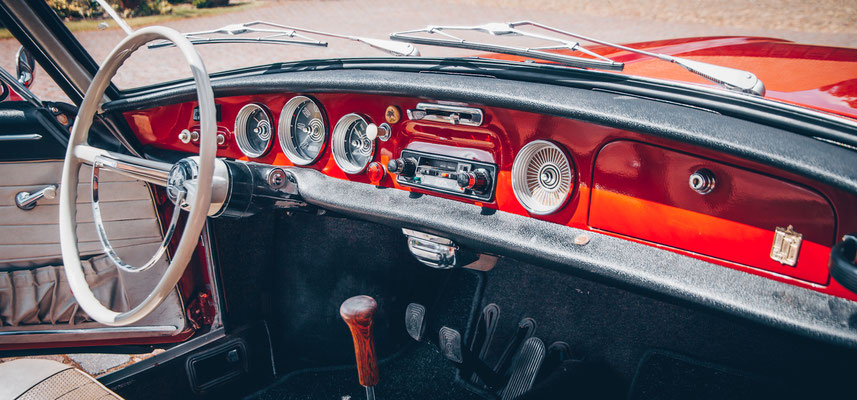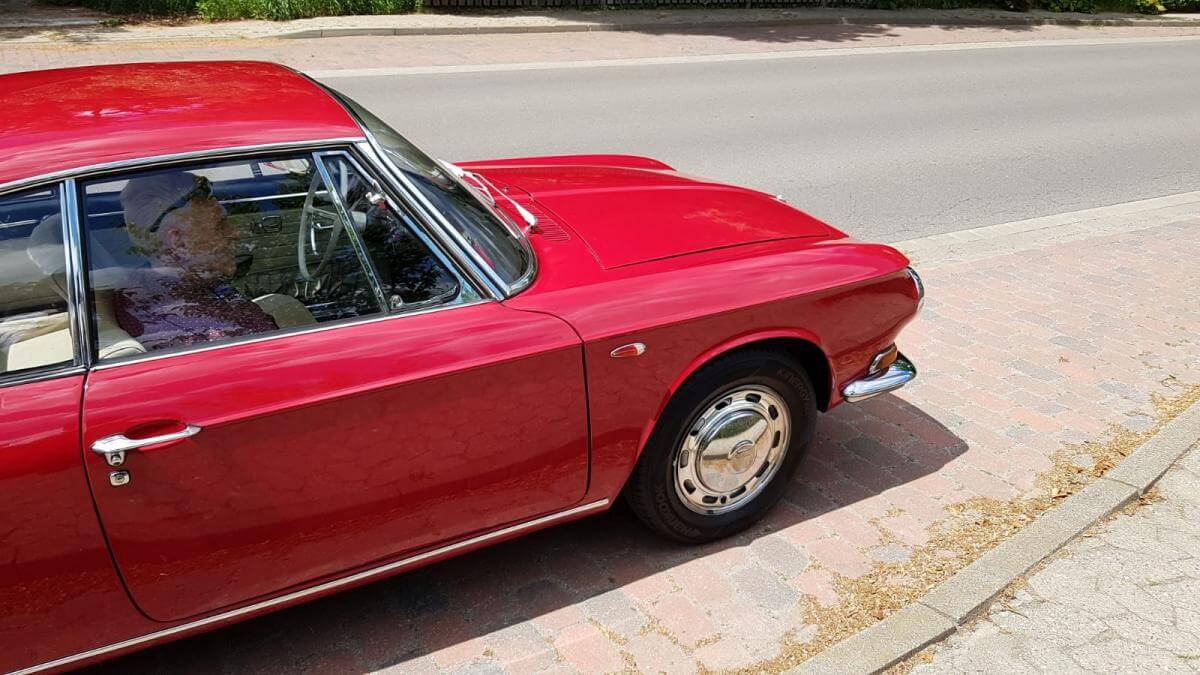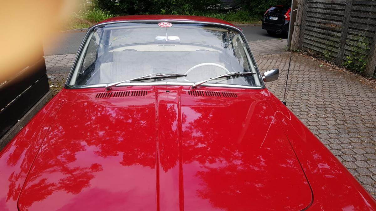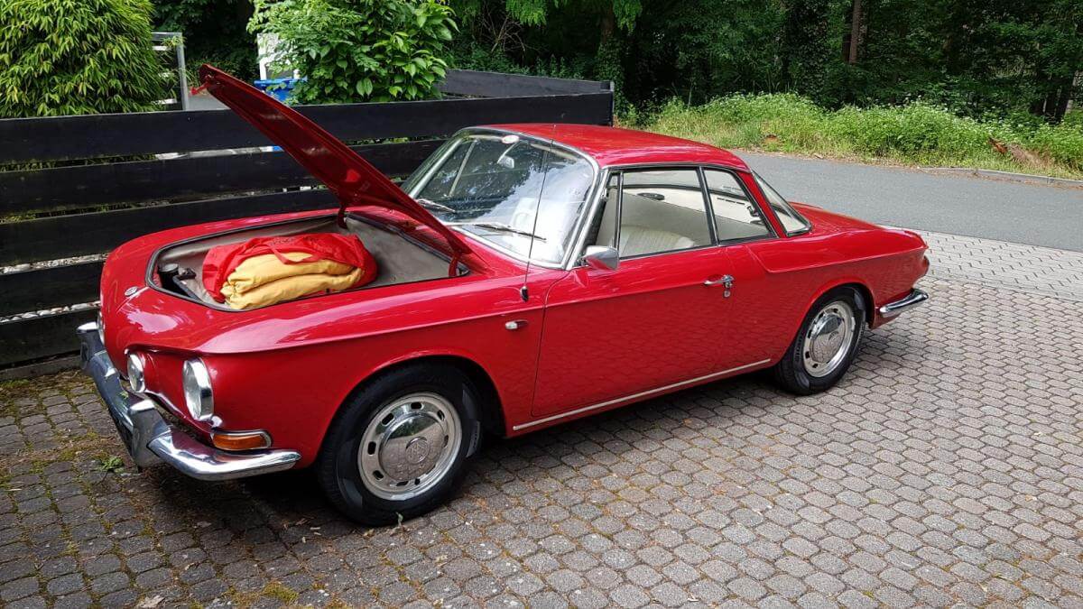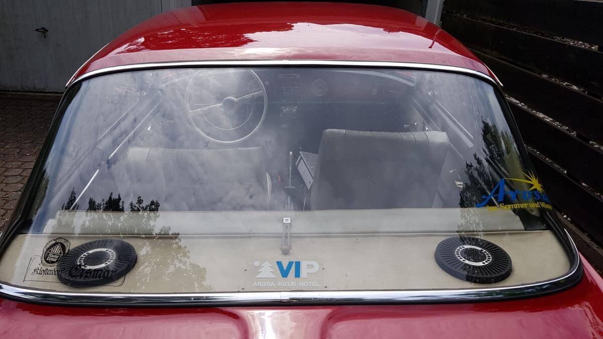 Das Fahrzeug verfügt über einen luftgekühlten Vierzylinder-Boxer-Motor mit 1310 cm³ und 40 kW (54 PS). Ein stilistisches Highlight ist definitiv die Farbkombination Rot mit weißer Lederausstattung und roten Seitenwangen. Dieses Coupé ist einfach elegant! Wir mögen auch die klaren Linien und die Panoramascheibe hinten.